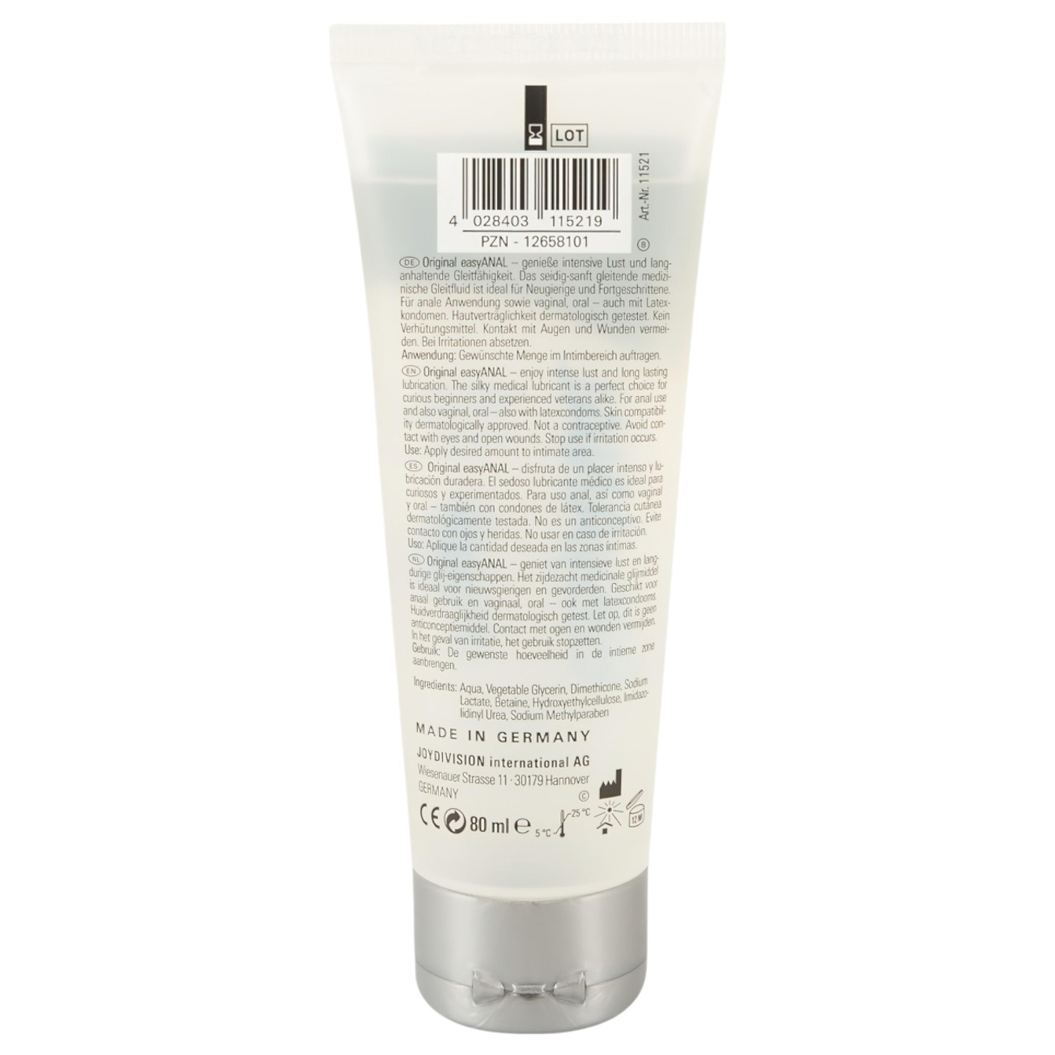 • easyANAL lubrificante: Textura sedosa, à base de glicerina e água, dermatologicamente e clinicamente testado