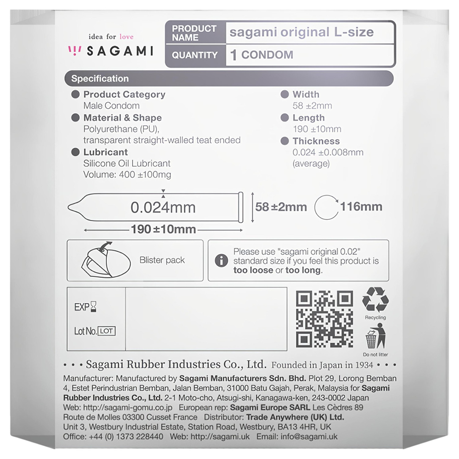 • 1 unidade de Sagami Original 0.02 L-Size preservativo